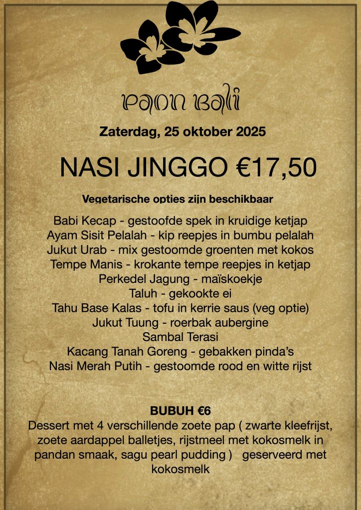 Door het concept OP is OP, maaltijd bestellen is nodig als U later dan 19:00 komt afhalen ( text only/WA +31 658991855 voor 17:00 ).